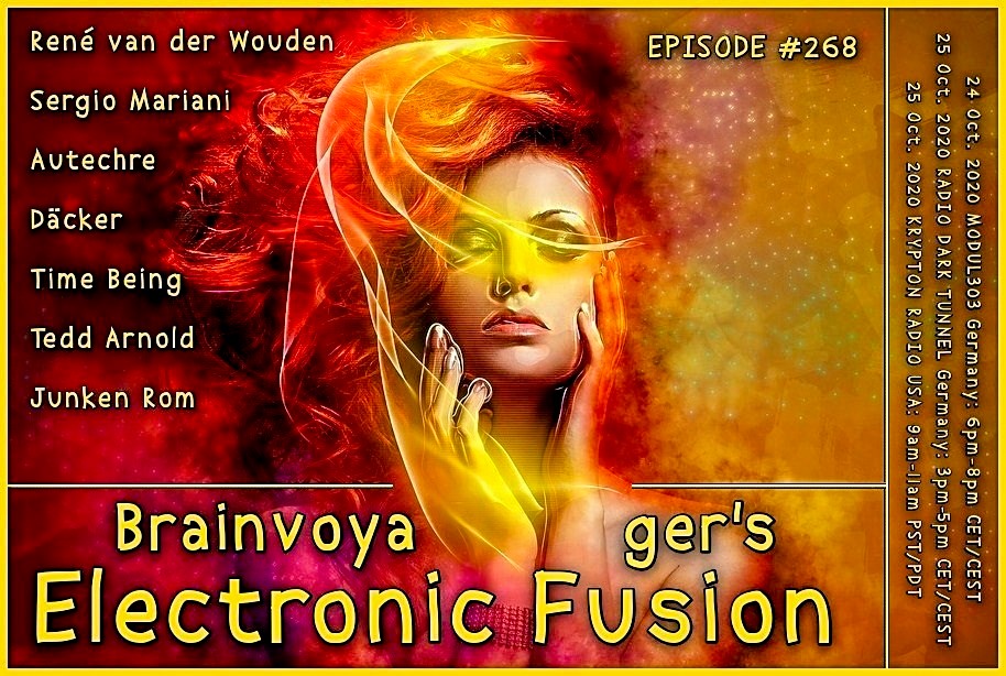 The weekly radio show ELECTRONIC FUSION is solely dedicated to electronic music of various styles and is hosted by Brainvoyager. The show took off with episode #1 on 18 September 2015..BROADCAST DATES (d-m-y) & SHOWTIMES of the NEW EPISODE #268:.Saturday 24-10-2020 at 6 pm CET/CEST on Modul303 from Germany..Sunday 25-10-2020 at 9 am PST/PDT on Krypton Radio from the USA..Sunday 25-10-2020 at 3 pm CET/CEST on Radio Dark Tunnel from Germany.